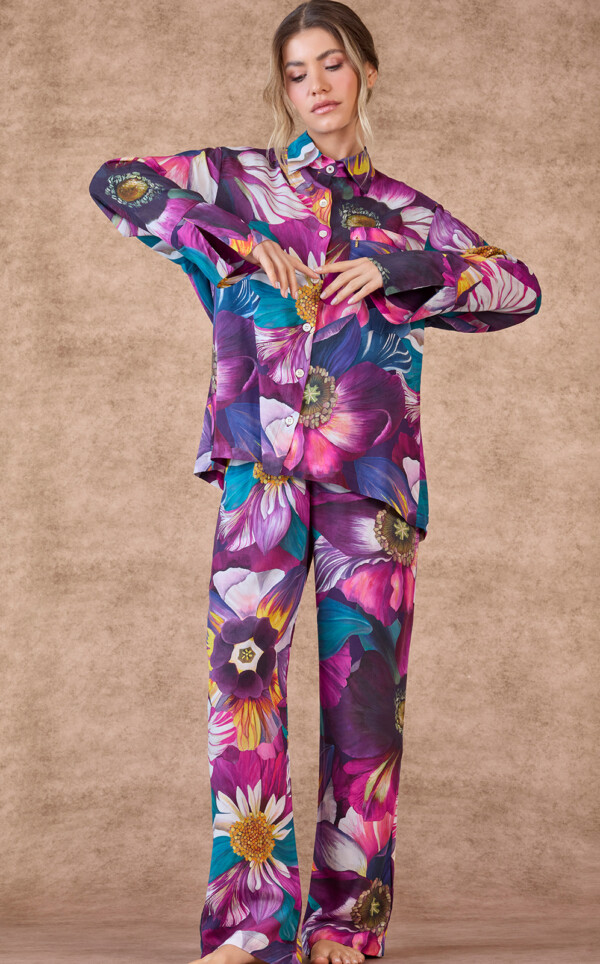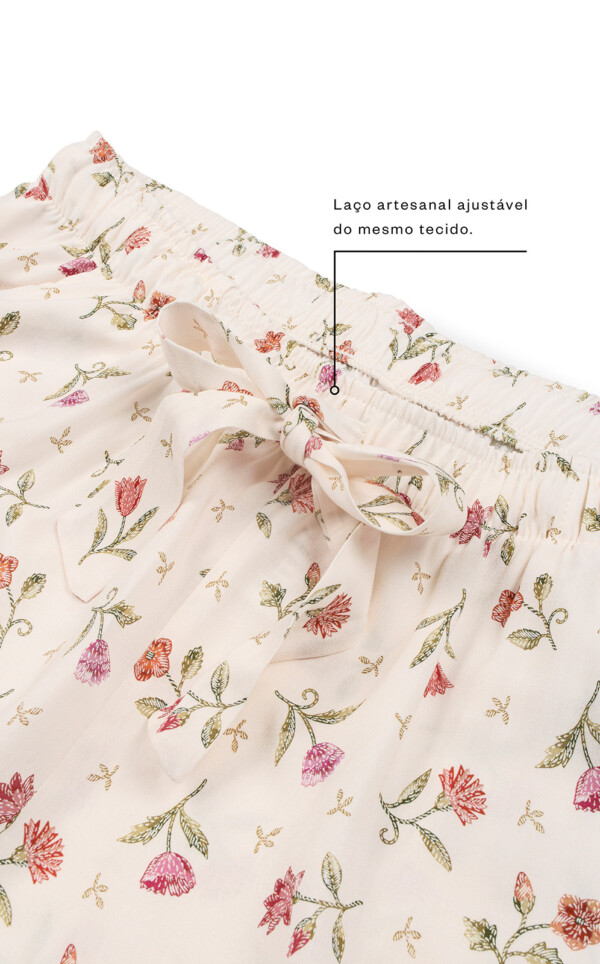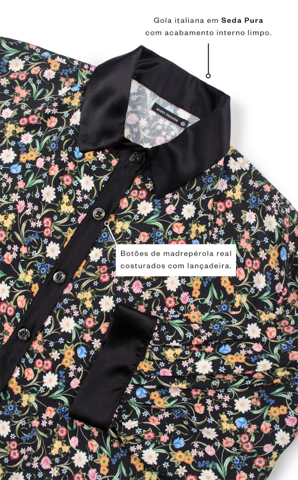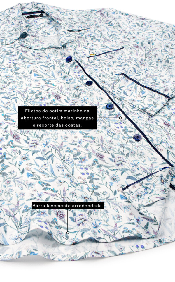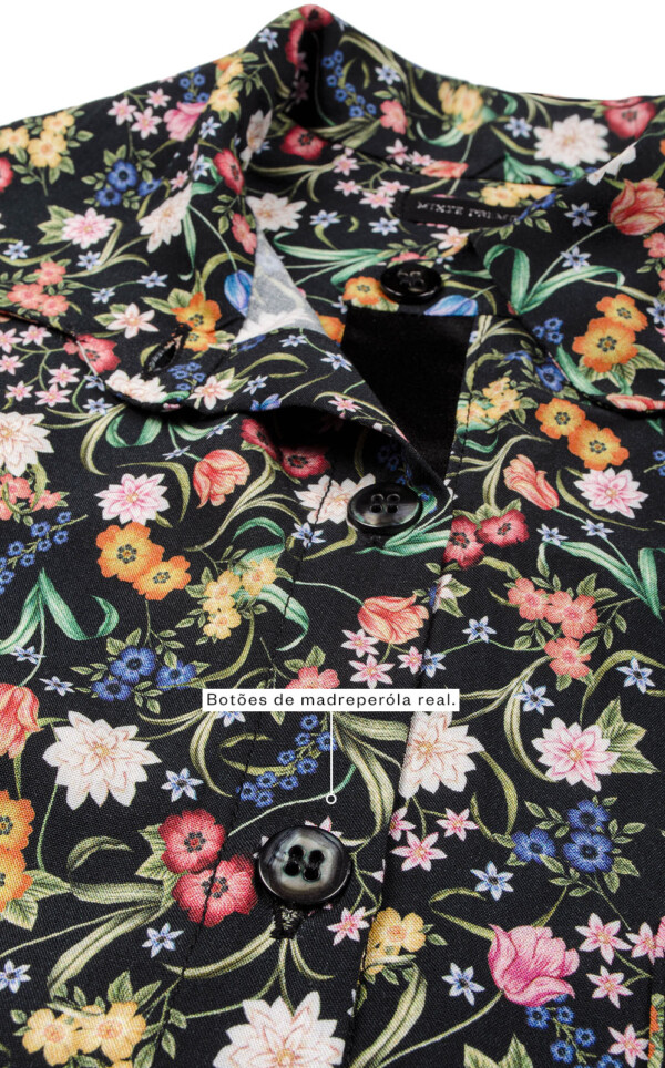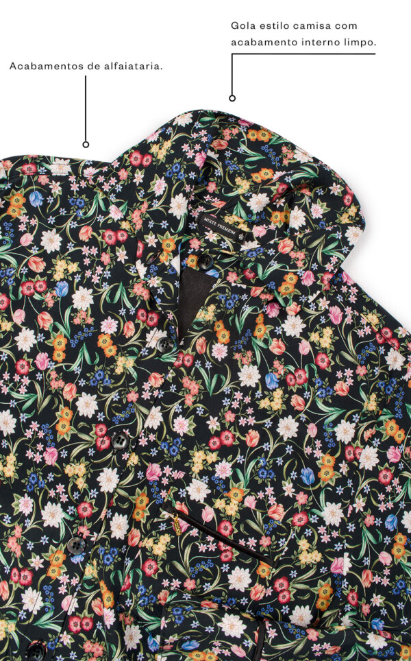 Realçamos a beleza das estampas únicas de Liberty® Fabrics com detalhes exclusivos de acabamento. Feitos inteiramente com costuras francesas, este detalhe deixa as terminações com visual limpo, ocultando as costuras internas. Acabamentos de alfaiataria por toda a peça garantem um drapeado elegante sob o corpo. Finalmente, os botões são feitos em madreperóla real, um toque adicional de nobreza que que destaca o luxo de seu novo conjunto.
