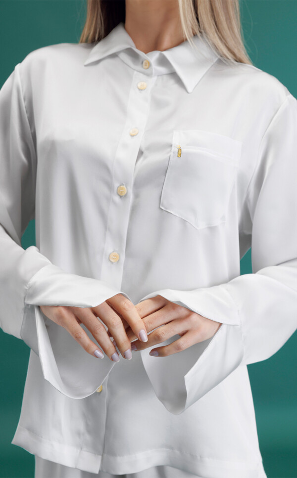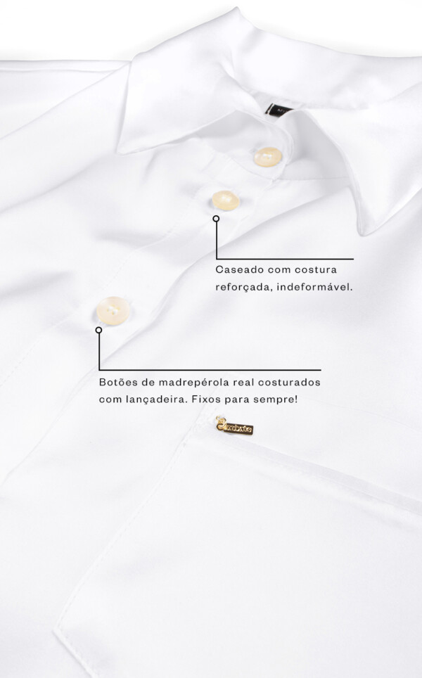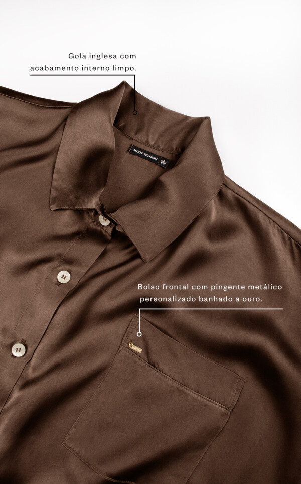 Nossos conjuntos em seda pura celebram a beleza natural desta fibra através de detalhes exclusivos de acabamento. Feitos inteiramente com costuras francesas utilizando fio de brilho, este detalhe deixa as terminações com visual limpo, ocultando as costuras internas. Acabamentos de alfaiataria por toda a peça garantem um drapeado elegante sob o corpo, e apliques de filete em seda pura realçam a opulência do conjunto. Finalmente, os botões são feitos em madreperóla real, um toque adicional de nobreza que certifica o lugar de seu pijama como o mais luxuoso do Brasil.