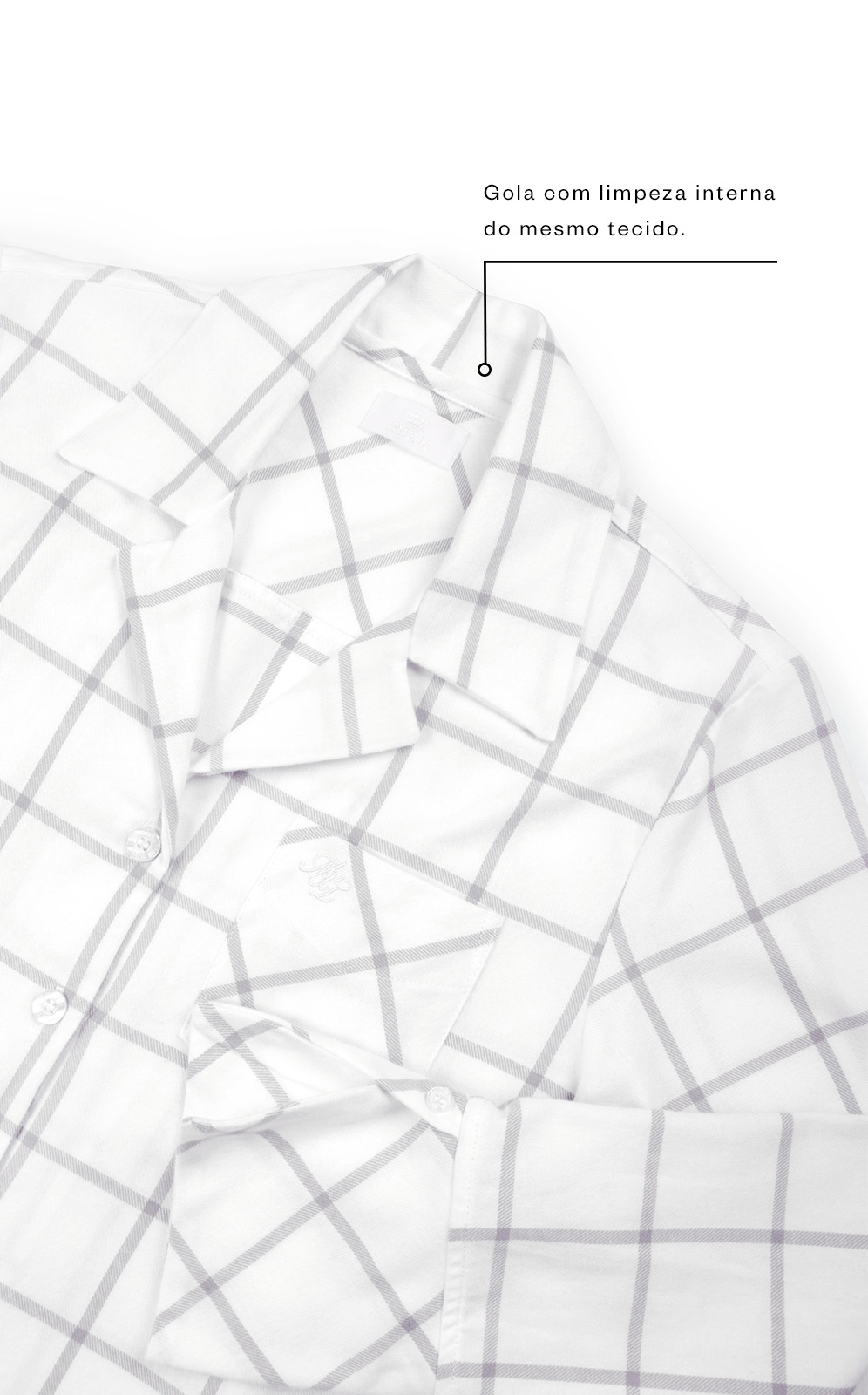 • Gola com acabamento de limpeza interna do mesmo tecido em diagonal.