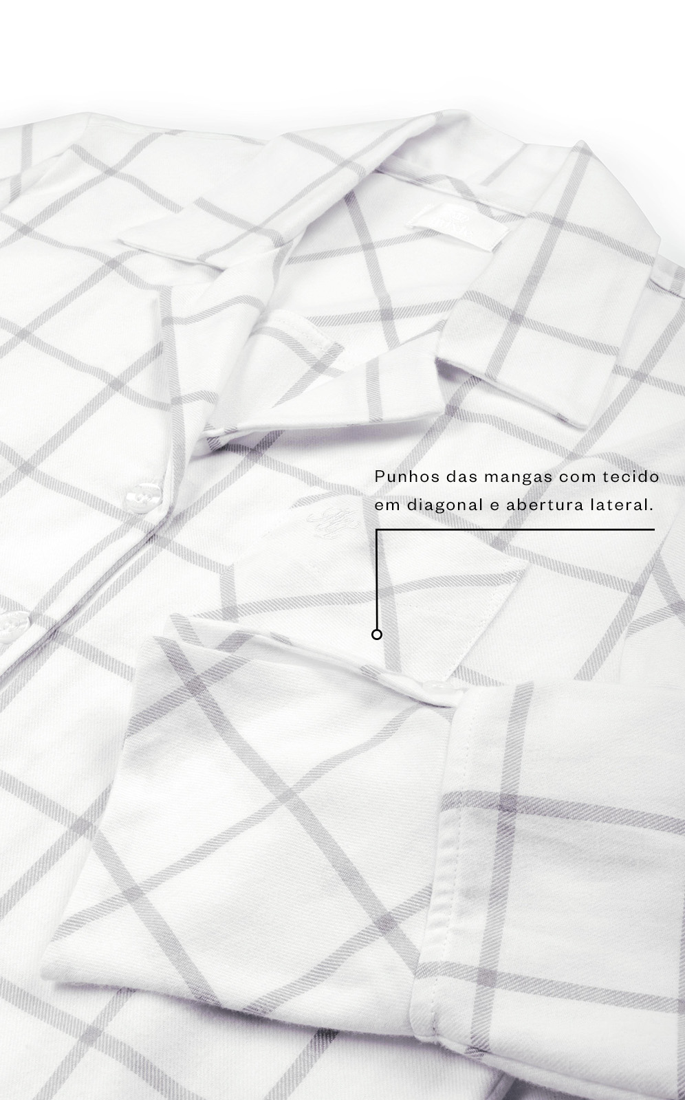 • Punho das mangas com tecido em diagonal e abertura lateral.
