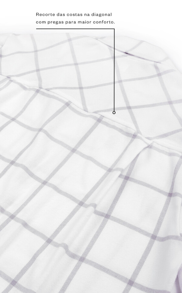 • Recorte das costas na diagonal com pregas para maior conforto.