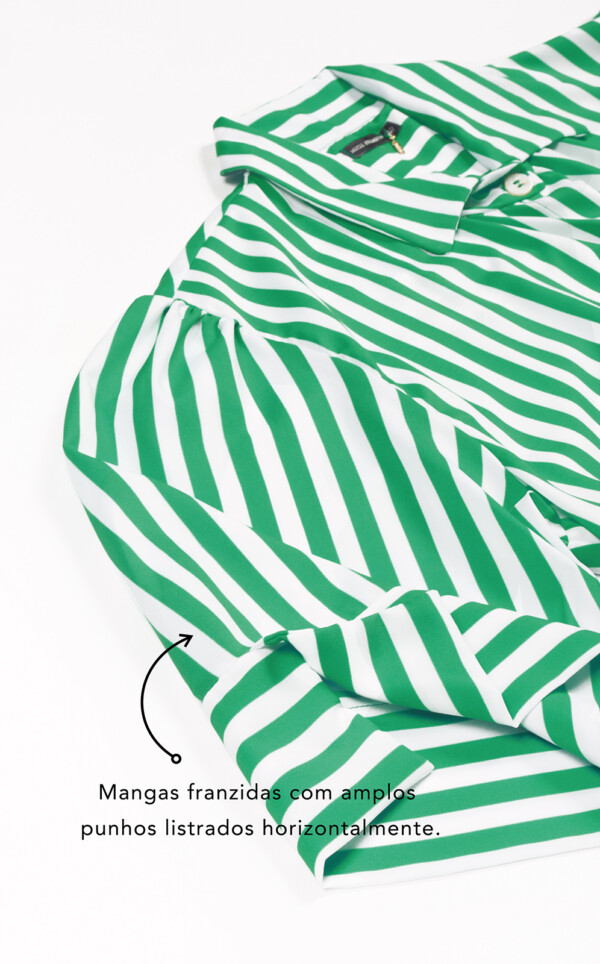 • Mangas franzidas com amplos punhos listrados horizontalmente.