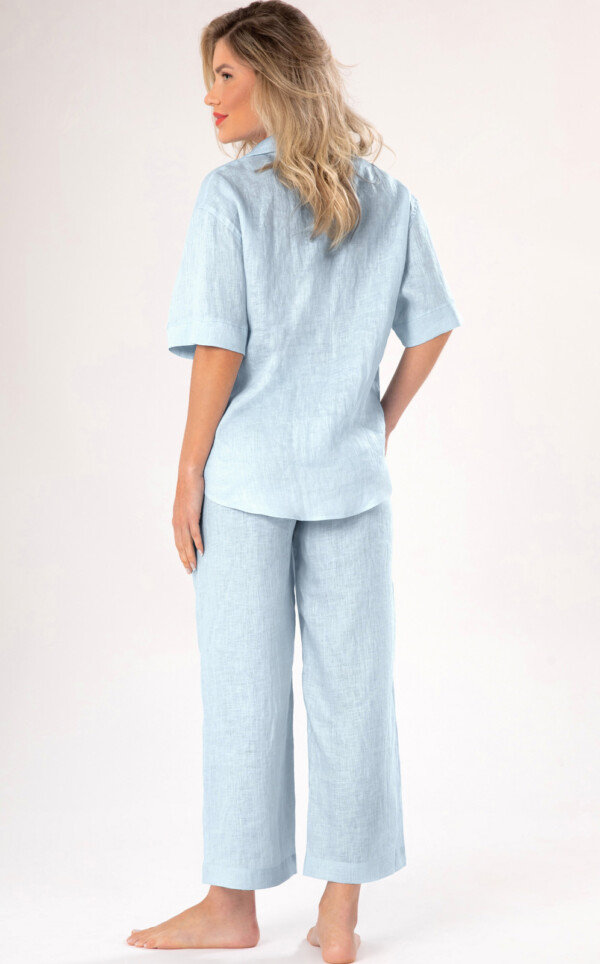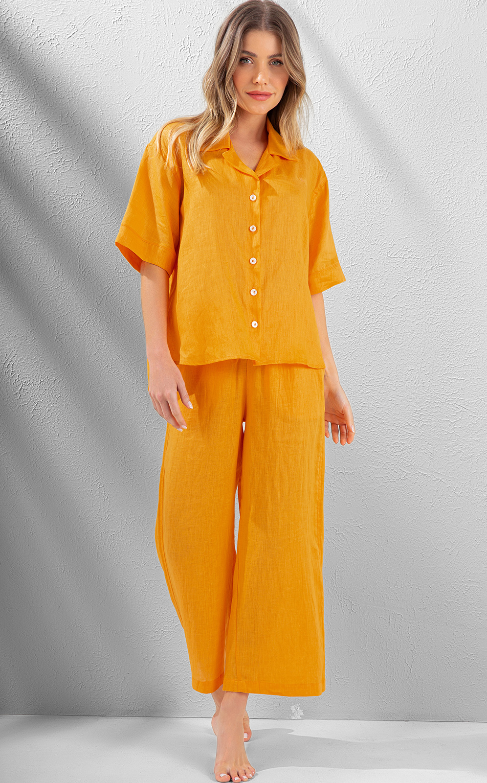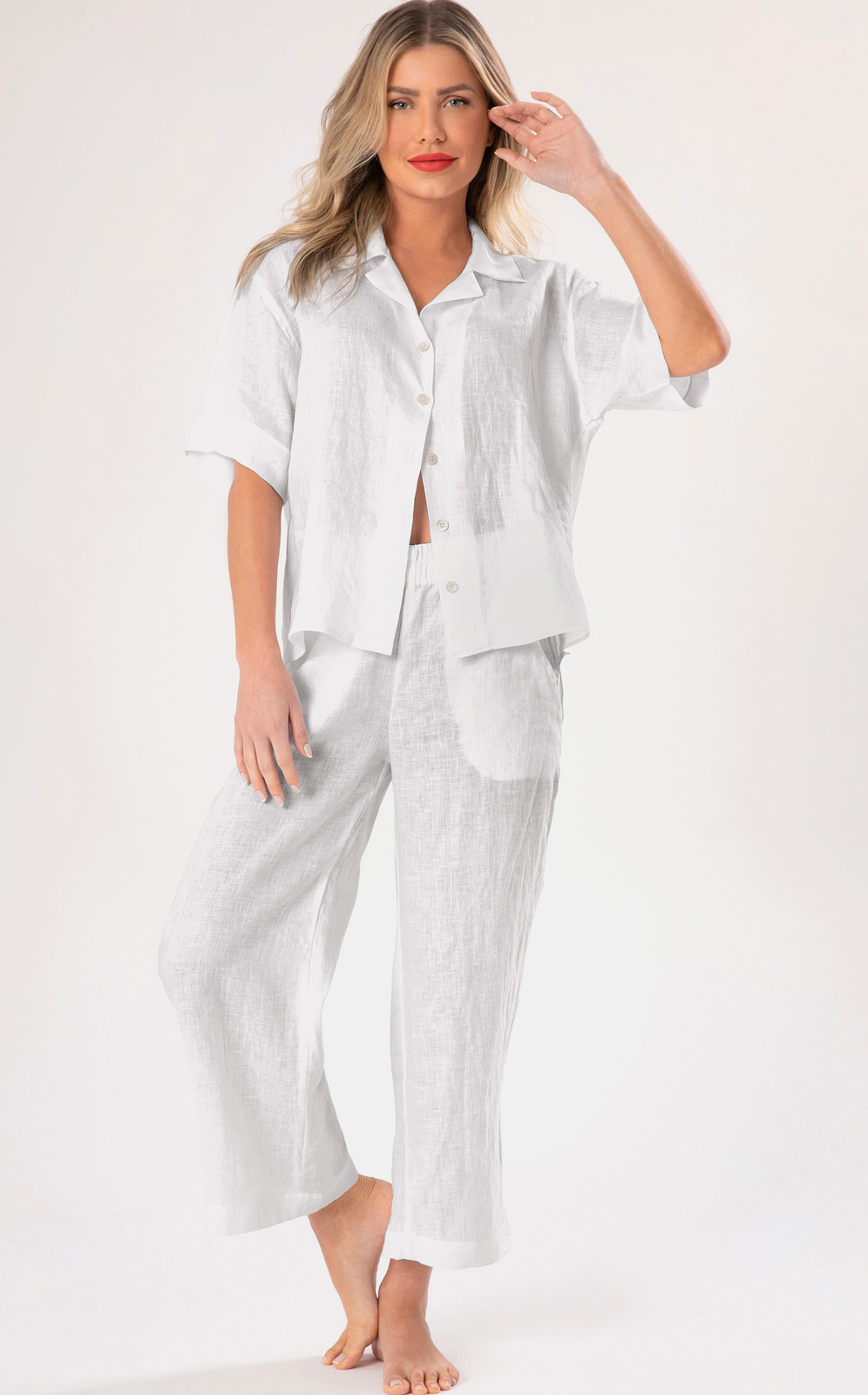 O tecido quintessencial do verão: totalmente natural, o fio de linho é um tecido durável e forte, porém leve e respirável. Por ser uma fibra com trama mais grossa, o tecido é menos propenso a se agarrar na pele, descansando sobre ela com sua textura refrescante e ondulada. O amassado é belo — esqueça o ferro de passar por alguns dias: estes conjuntos ficam melhores quanto mais forem utilizados e ganham beleza ao passar do tempo.