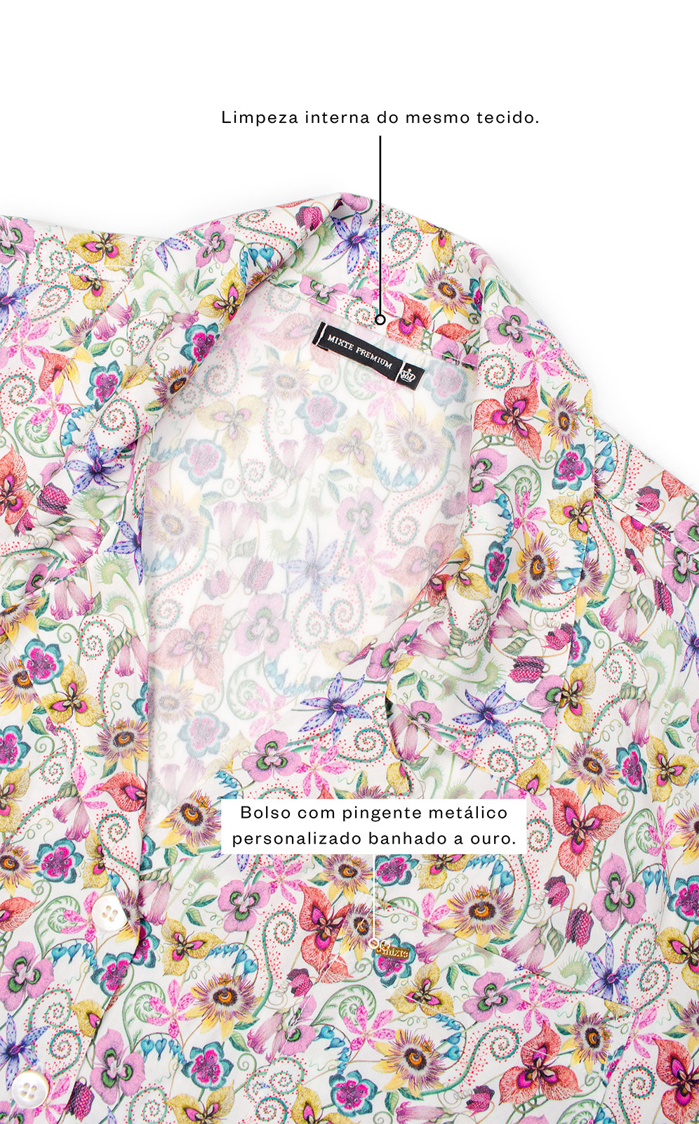 • Botões de madrepérola real costurados com lançadeira (não descosturam).