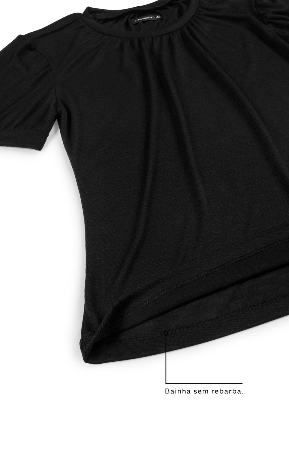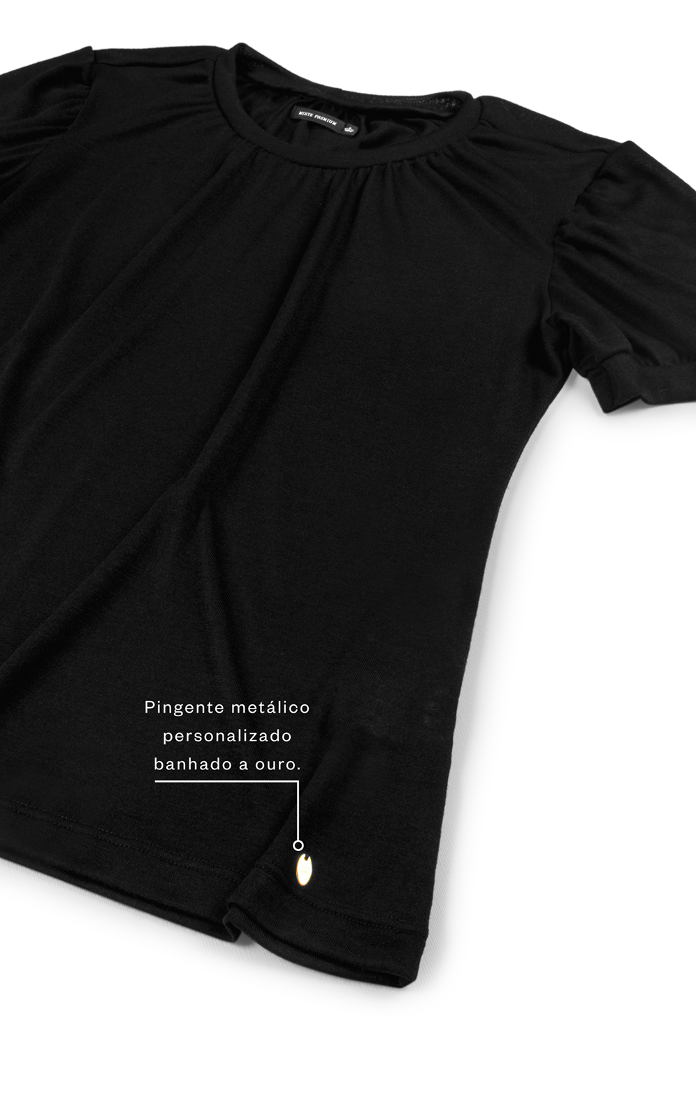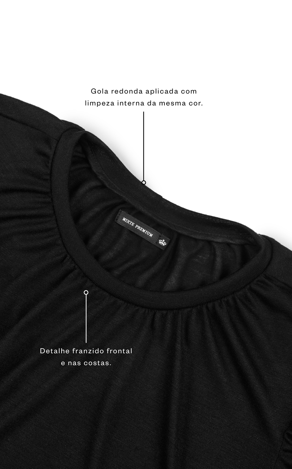 • Gola redonda aplicada com acabamento interno do mesmo tecido.